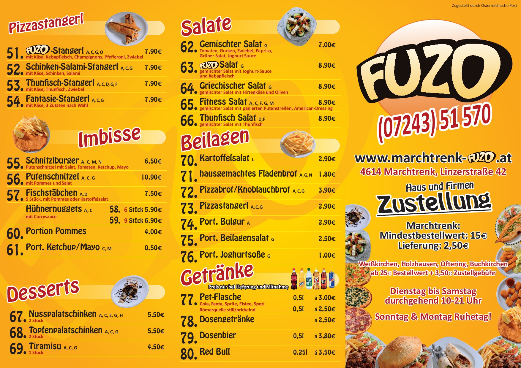 Für Ihren Appetit steht Ihnen eine große Speisekarte zur Verfügung. Wir liefern in Marchtrenk ab einem Mindestbestellwert von 15,- Euro mit Aufpreis für die Anfahrt von 2,50- Euro, in Weißkirchen, Holzhausen und Oftering liefern wir ab 25,- Euro Bestellwert für 3,50 Euro.