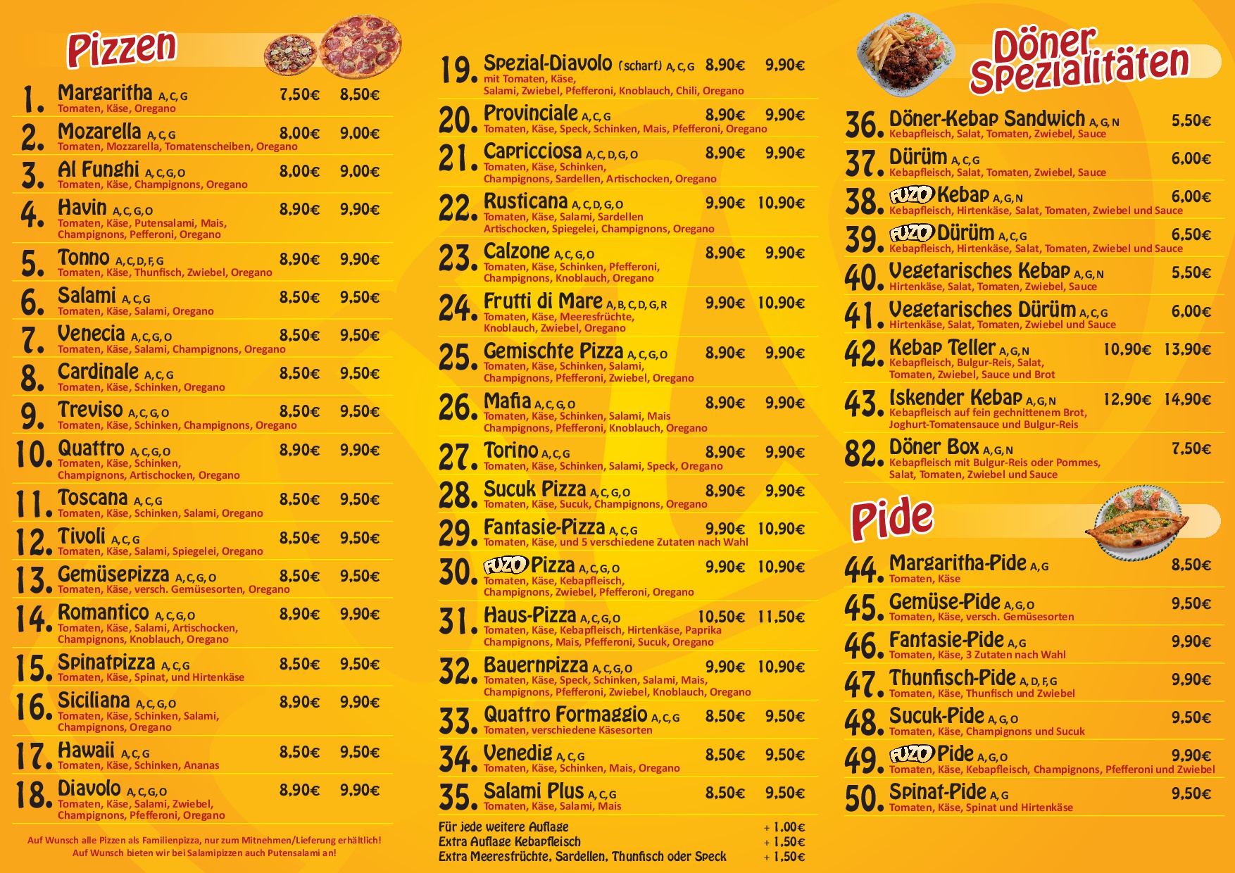 Ob köstliche Pizza oder Döner Spezialitäten – wir liefern Ihnen mit unserem Lieferservice alles, was Sie auf unserer Speisekarte finden. Wir bringen Ihre Lieblingsspeise für den gemütlichen Abend zu Ihnen nach Hause oder für die Mittagspause in die Firma.