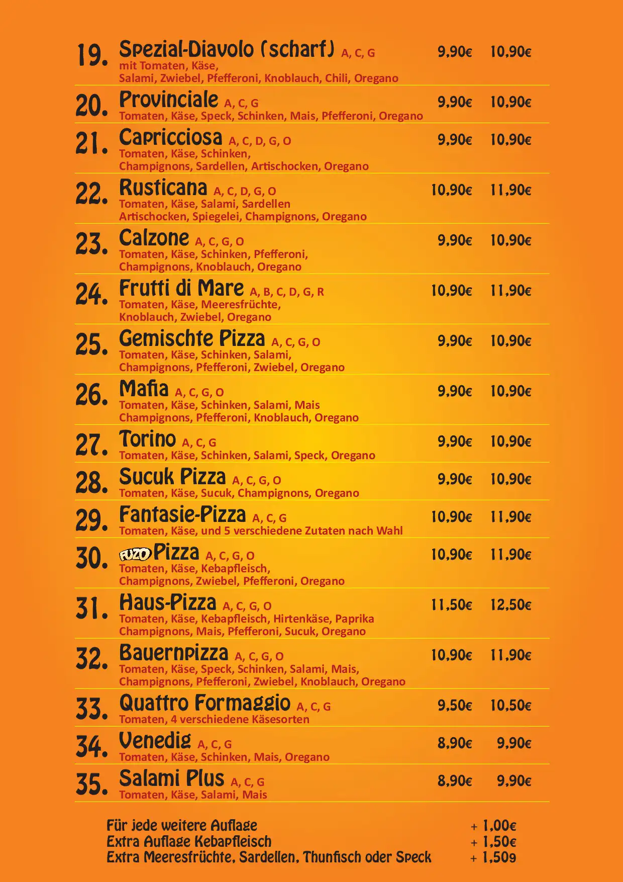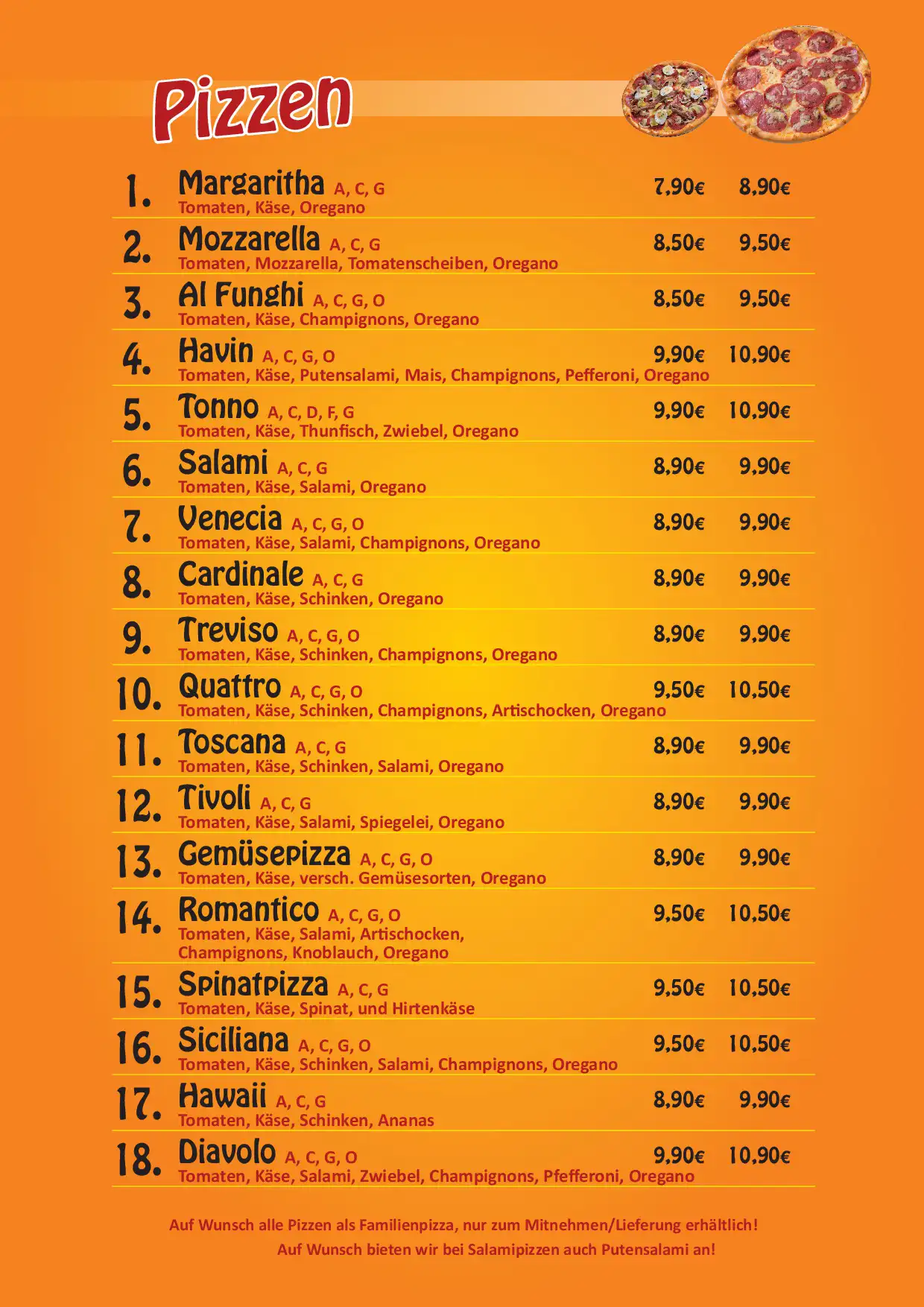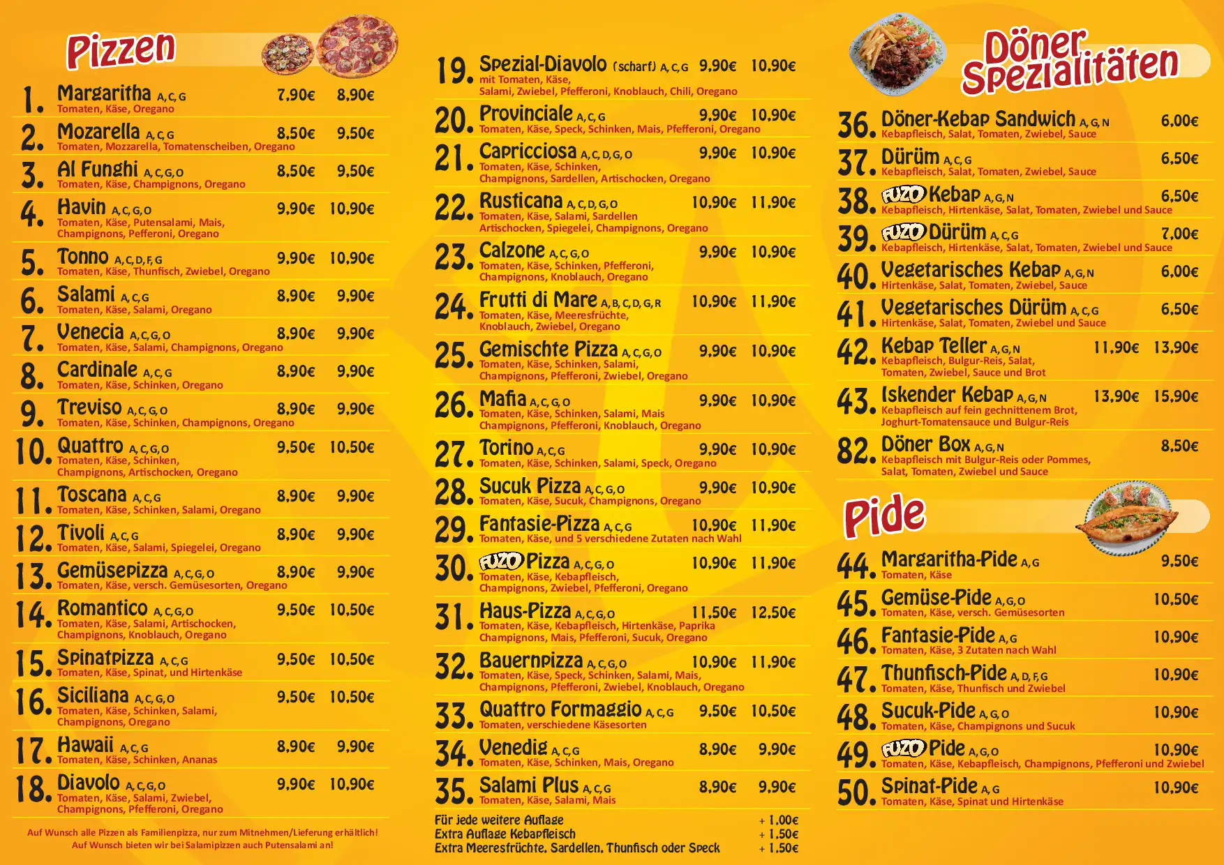 Haben Sie Appetit auf Pizza? Dann haben Sie bei uns eine umfangreiche Auswahl. Von der klassischen Margaritha bis zur Fantasie-Pizza, der Pizza Mafia und vielen, vielen anderen Möglichkeiten reicht die Palette. Lieben Sie Döner oder Piden? Dann schlagen Sie zu bei unseren Spezialitäten. Es erwarten Sie schmackhafte vegetarische Variationen. Wer gerne ins Schnitzel beißt, schaut sich bei unseren Imbissen um. Von der Schnitzelburger bis zu Fischstäbchen reicht unser Angebot.